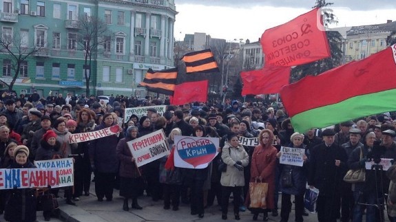 Участники митинга выступают за объединение с Россией и Беларусью. Также они высказали поддержку жителям Крыма, где сегодня проводится референдум, не признанный официальными властями Украины.