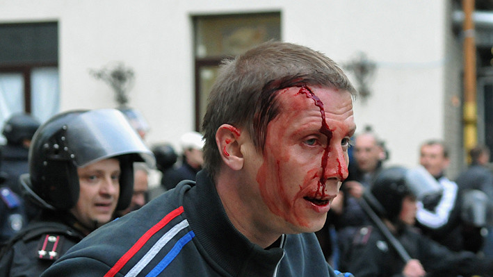 Во время столкновений пострадал корреспондент "Зеркала недели. Украина" Евгений Шибалов. Ему попали камнем в голову. !zn