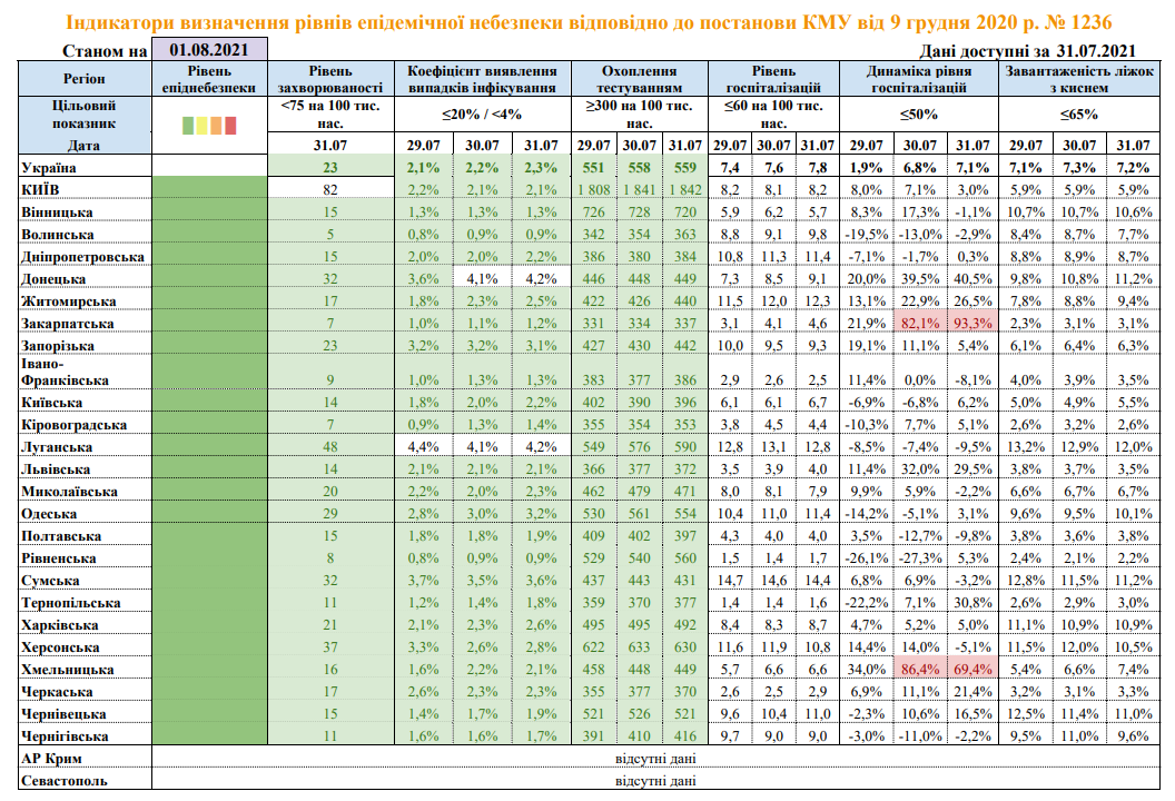 В Закарпатской и Хмельницкой областях превышены показатели динамики уровня госпитализаций больных ковидом, свидетельствуют данные Минздрава на 31 июля. На сегодняшний день все регионы Украины находятся в «зеленой» зоне карантина.
