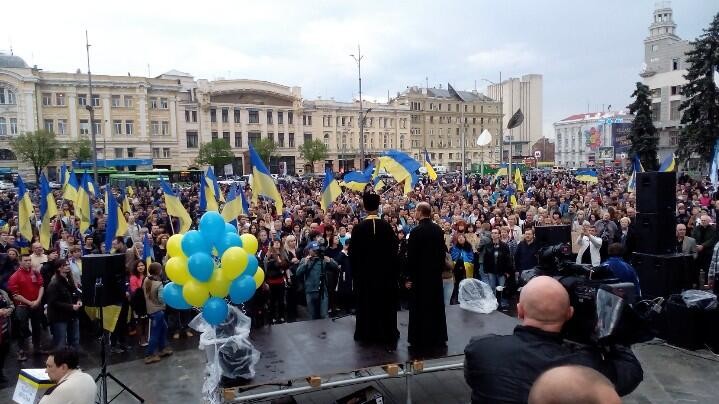 В Харькове на митинг в поддержку единства Украины на площади Конституции пришло около 7 тысяч человек. Об этом пишут активисты сообщества "IT Sector Харьков" в своем Twitter.