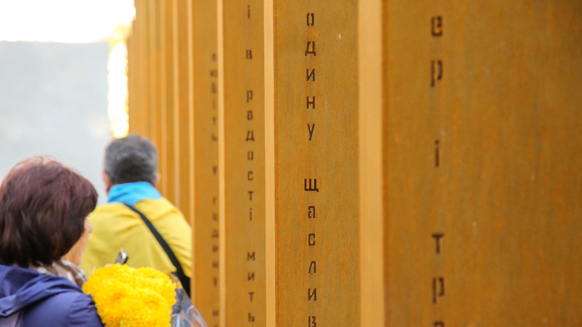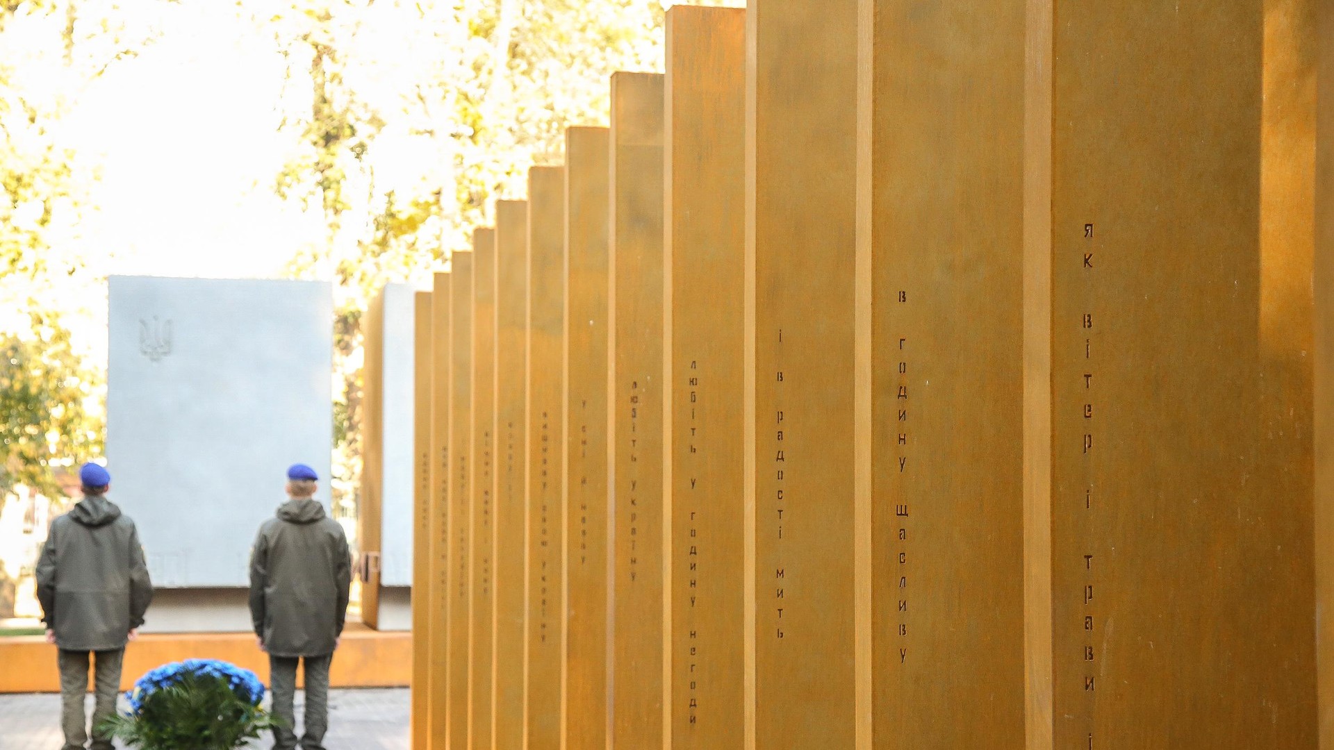 "14 колонн украшены строками из стихотворения Владимира Сосюры "Любіть Україну" и куб, символизирующий Украину, составляют целостную композицию монументального комплекса", - говорится в сообщении, опубликованном на официальной странице Северо-Восточного отдела Украинского института национальной памяти в Facebook в понедельник, 14 октября.