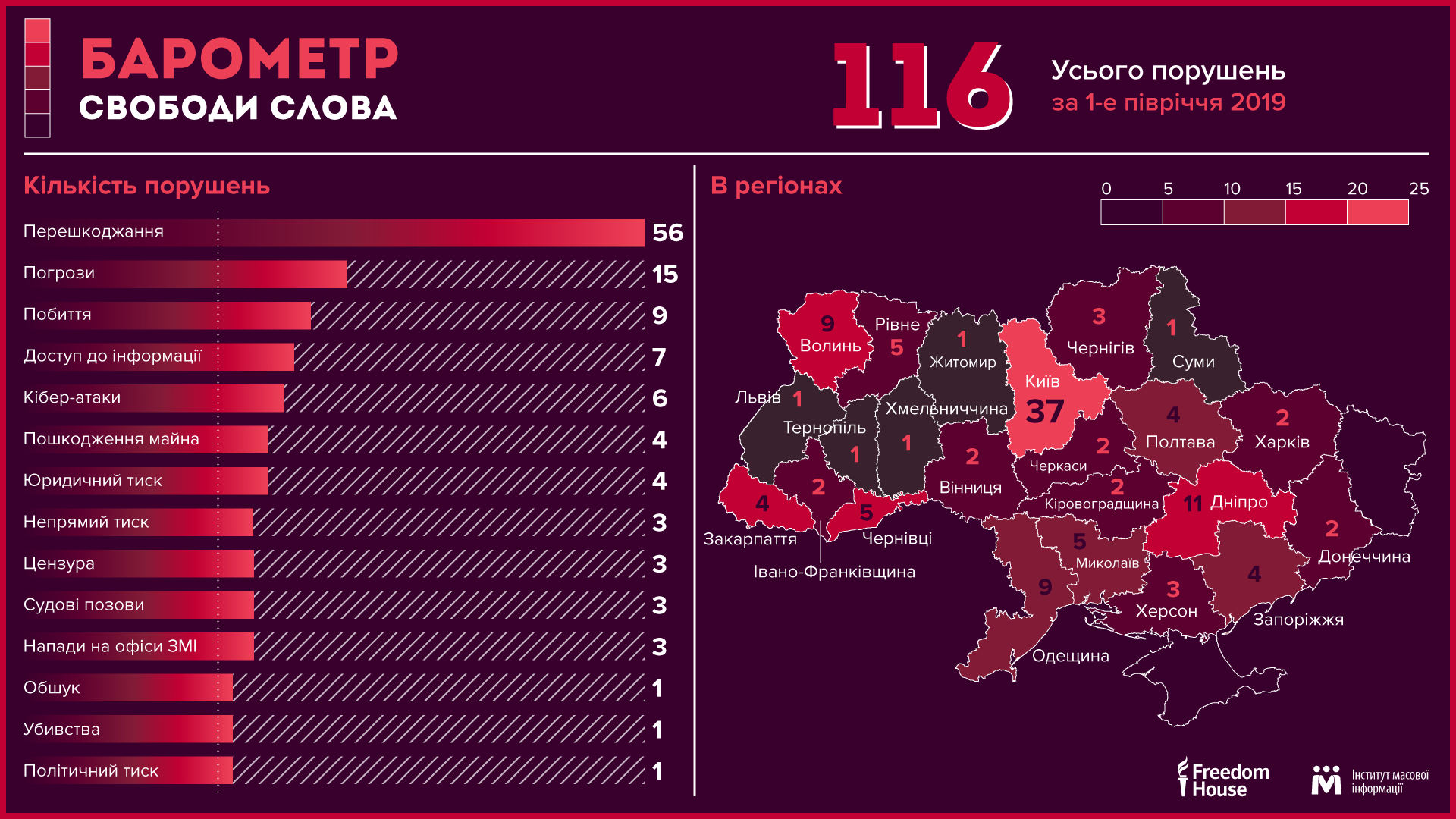 В целом нарушения свободы слова произошли в 23 регионах Украины, больше всего (37 случаев) в Киевской области.