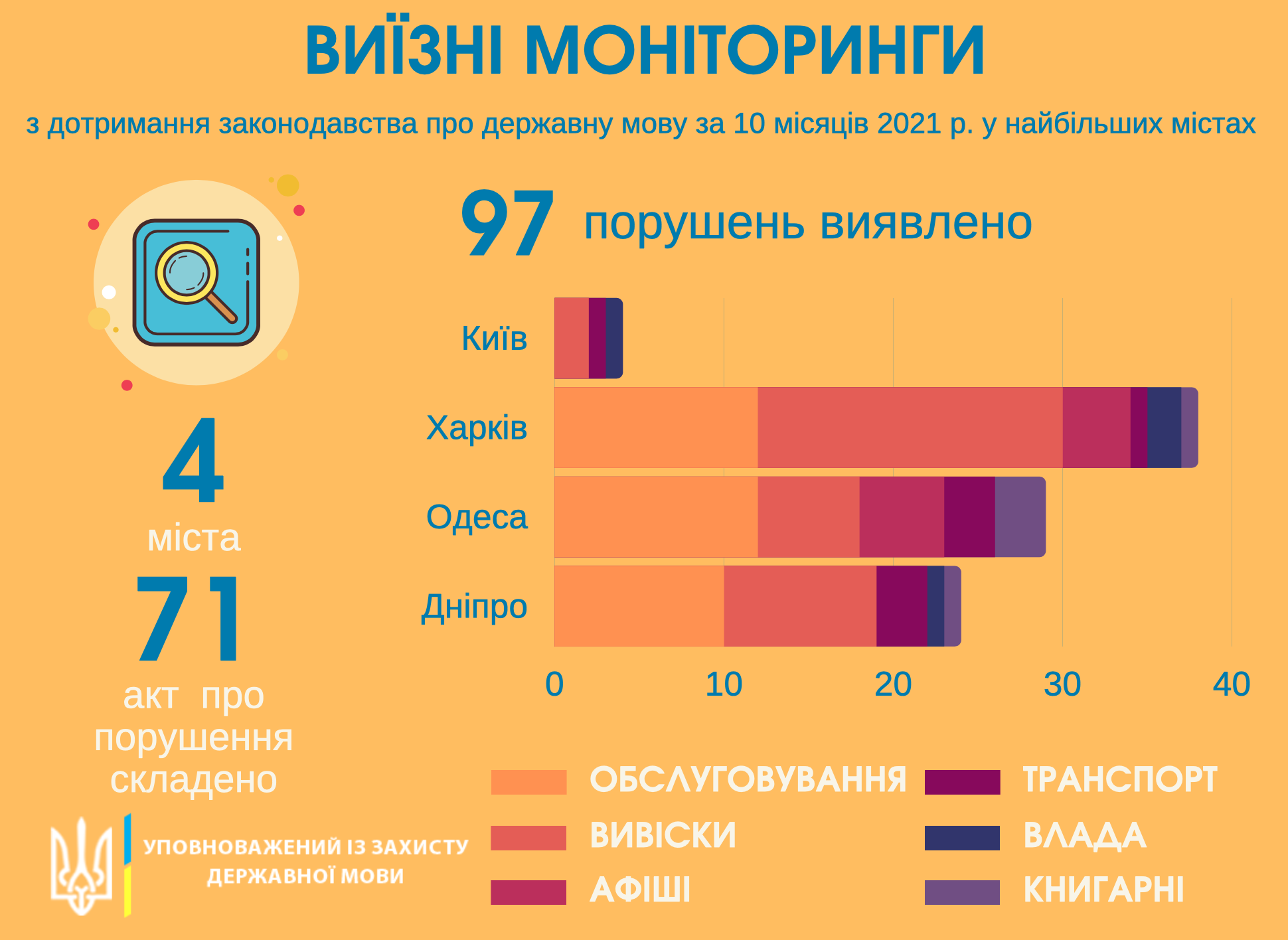 Специалисты проверяли деятельность органов местной власти, сферы обслуживания, заведений культуры. По состоянию 1 ноября было выявлено 97 нарушений законодательства о государственном языке. Больше всего они зафиксированы в Харькове – 38. В Одессе выявлено 30 нарушений, в Днепре – 25, в Киеве – 4 нарушения.
