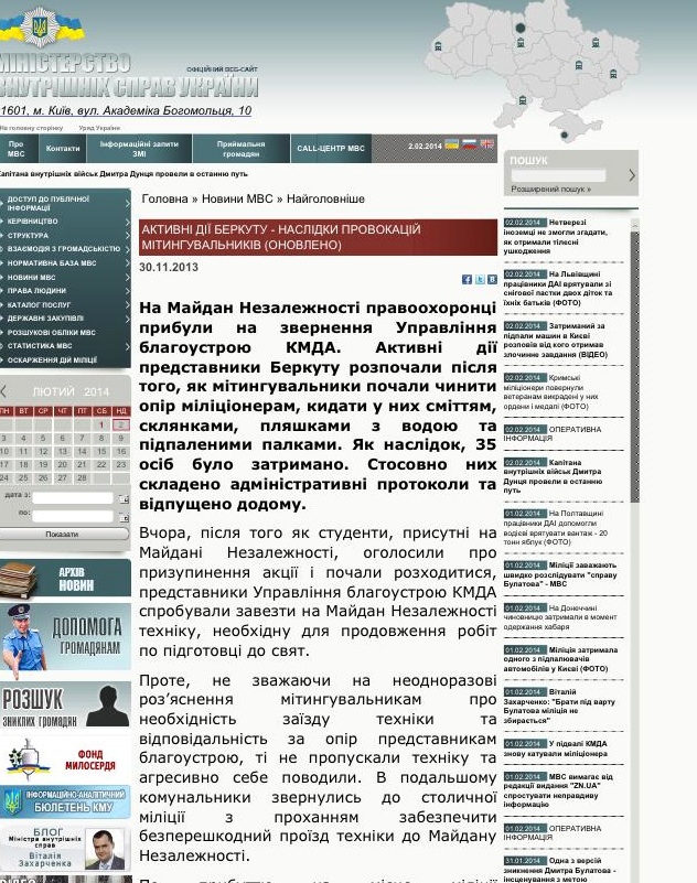 Как доказательство, он опубликовал скриншот с сайта МВД, где в информационном сообщении, датированном 30.11.2013 г., говорится, что "на Майдан Независимости правоохранители прибыли на обращение Управления благоустройства КГГА".