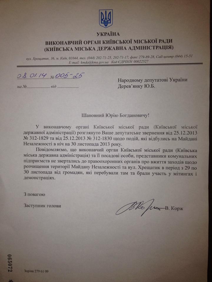 "Сообщаем, что исполнительный орган Киевского городского совета (Киевская городская государственная администрация) и ее должностные лица, представители коммунальных предприятий не обращались в правоохранительные органы относительно принятия мер по расчистке территории Майдана Независимости и улицы Крещатик в период с 29 по 30 ноября от граждан, которые пребывали там и принимали участие в митингах и демонстрациях", – говорится в документе.