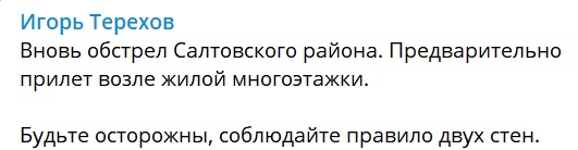 По данным городского головы Игоря Терехова, под обстрел попал Салтовский район. На месте "прилета" возник пожар.
