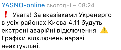 Тем временем Telegram-бот компании Yasno сообщает, что по указаниям "Укрэнерго" сегодня во всех районах столицы будут экстренные аварийные отключения. Так что графики отключений сейчас неактуальны.