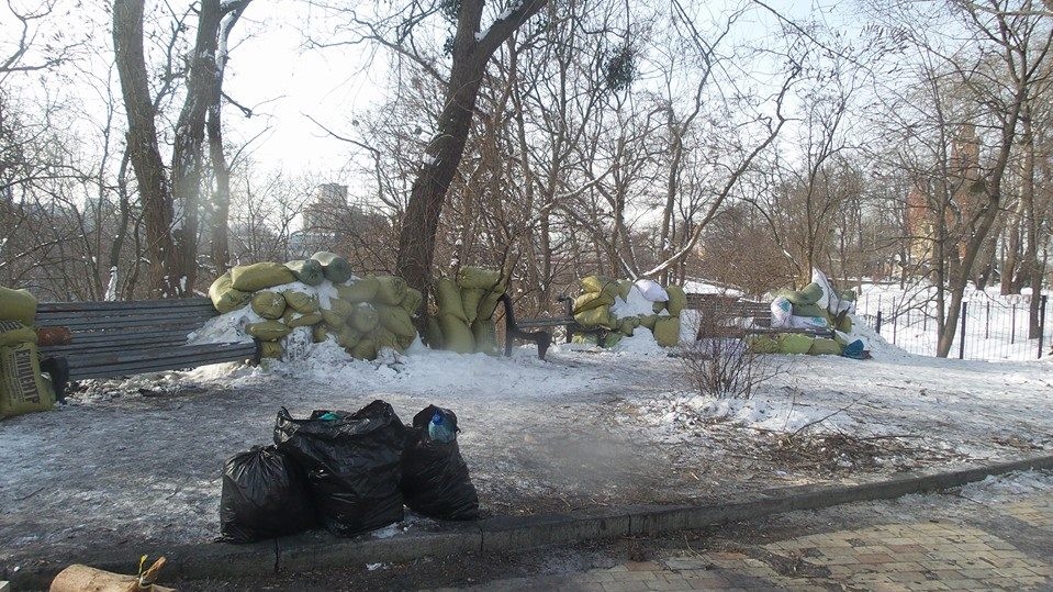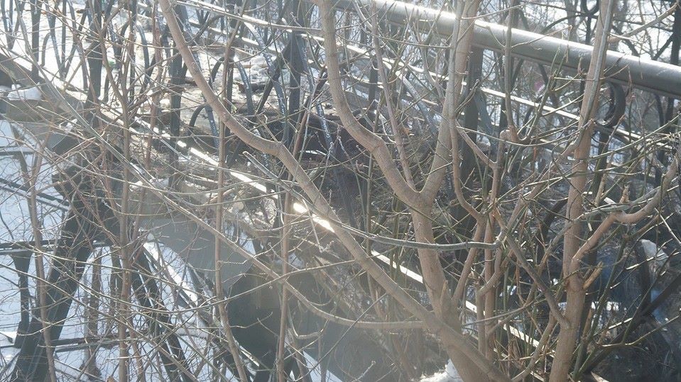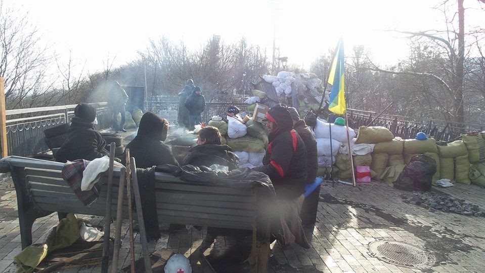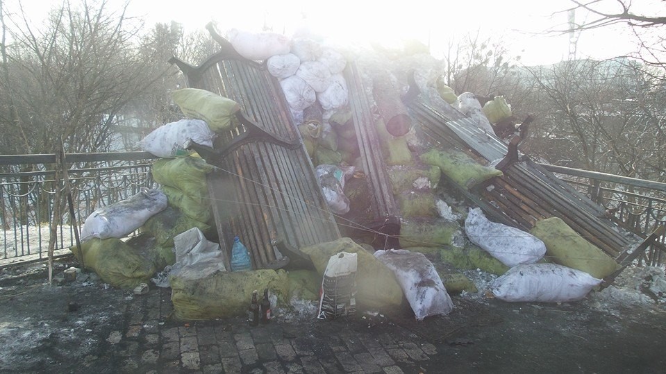 Возле моста установлен пункт протестующих, вход на мост заблокирован баррикадой из мешков со снегом и льдом и парковых скамеек. Со стороны протестующих выгорело около трех метров покрытия моста - здесь жгли покрышки. Около десятка шин все еще сложены в стороне. Протестующие греются у огня.