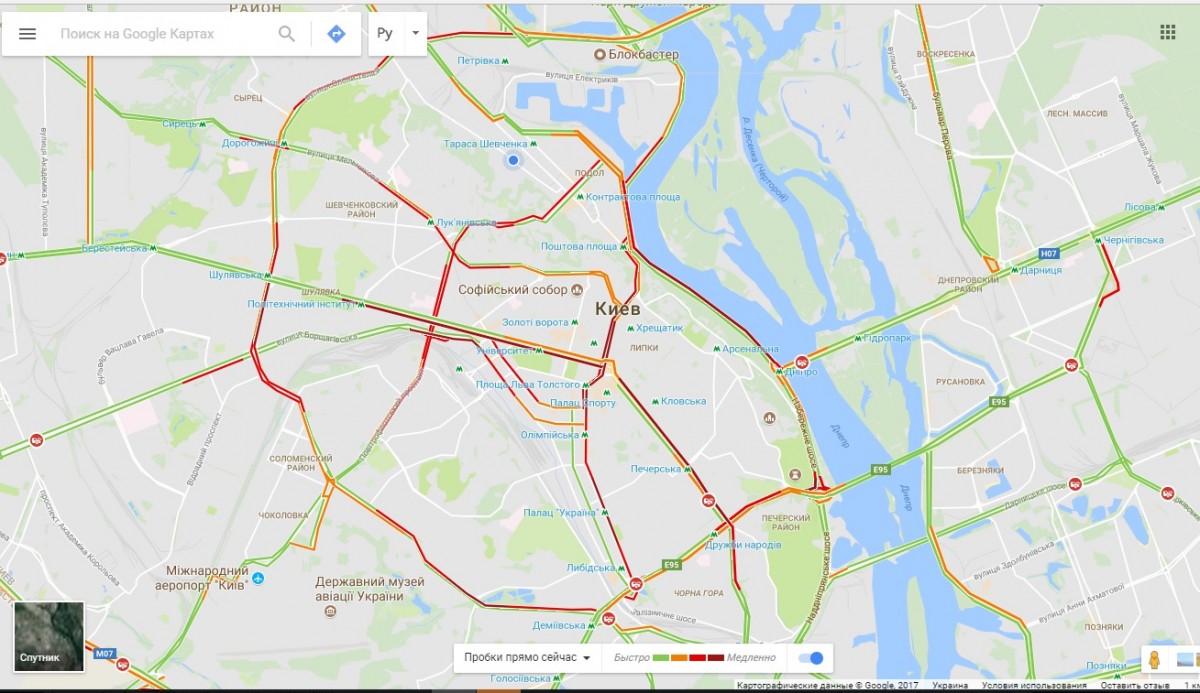 В Киеве образовались огромные пробки, затруднено движение транспорта в центре города. Согласно данным сервиса Google Maps, движение остановилось на Крещатике и улице Михайловской, Парковой дороге, Бессарабской площади, Владимирском спуске и улице Московской.