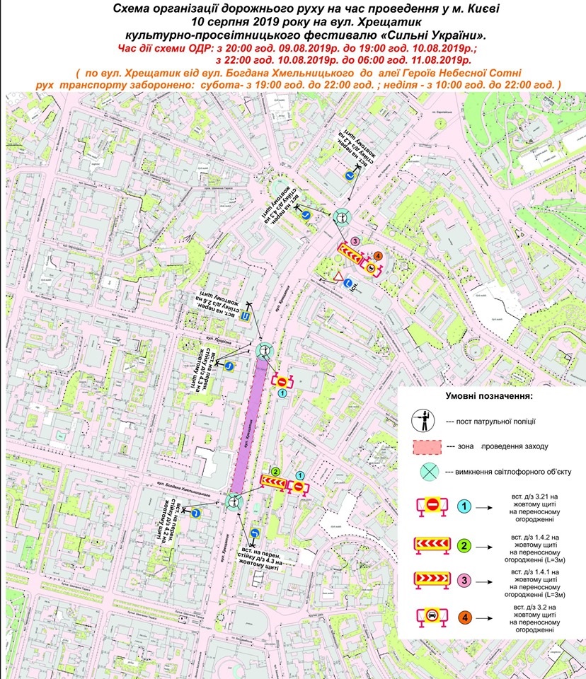 "Во время подготовки локации и в течение фестиваля часть улицы Крещатик (от пересечения с улицей Прорезной до пересечения с улицей Богдана Хмельницкого) будет закрыта для автомобильного движения. Так, согласно распоряжению КГГА №1402, запрет движения всех видов транспортных средств будет длиться с 20:00 9 августа до 06:00 11 августа", - говорится в сообщении.