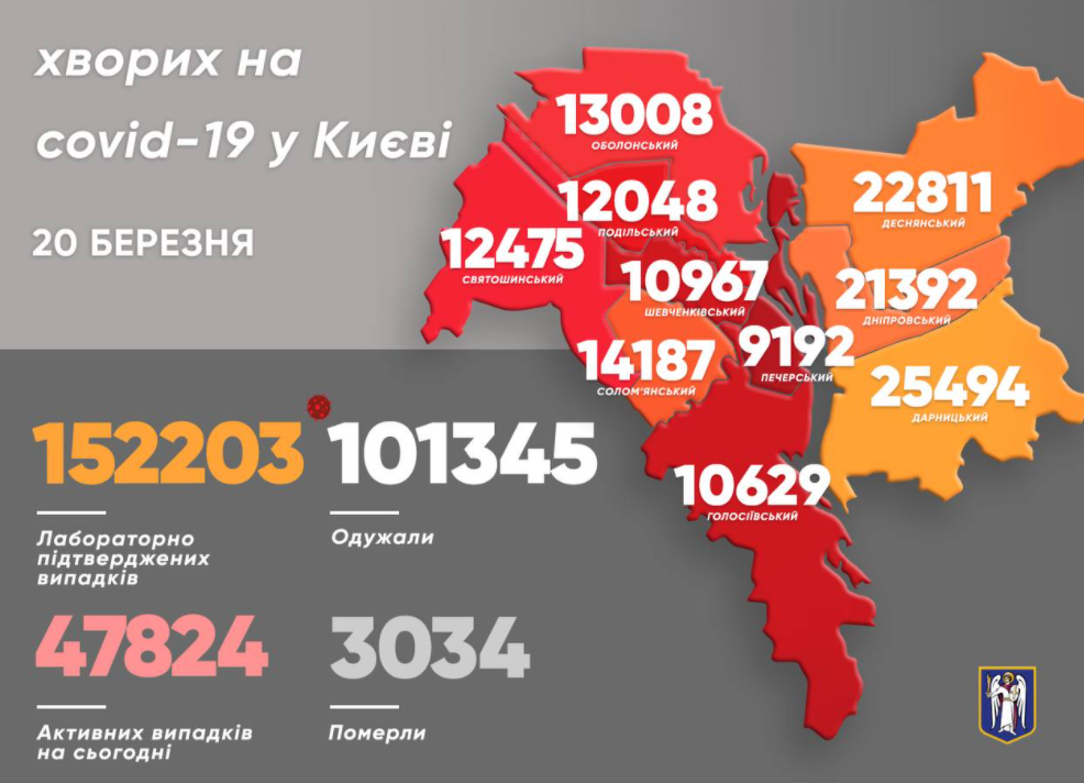 Подтвержденных случаев заболевания в столице на сегодняшний день уже 152 203. Коронавирус преодолели 101 345 киевлян. За период пандемии в городе зафиксировали 3 034 летальных случая от вируса.