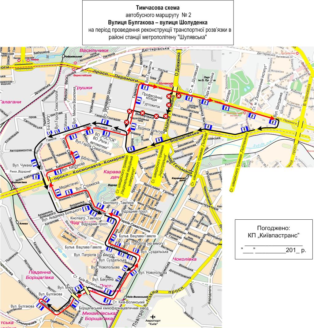 Также из-за ремонтных работ вносятся изменения в движение общественного транспорта. Автобусы маршрута № 2 будут следовать по следующей схеме: от вул. Булгакова до станции метро "Шулявская" по постоянной схеме, далее: просп. Победы – ул. Шолуденко – вул. Борщаговская – ул. Гарматная – бульвар Вацлава Гавела, далее – по постоянной схеме.