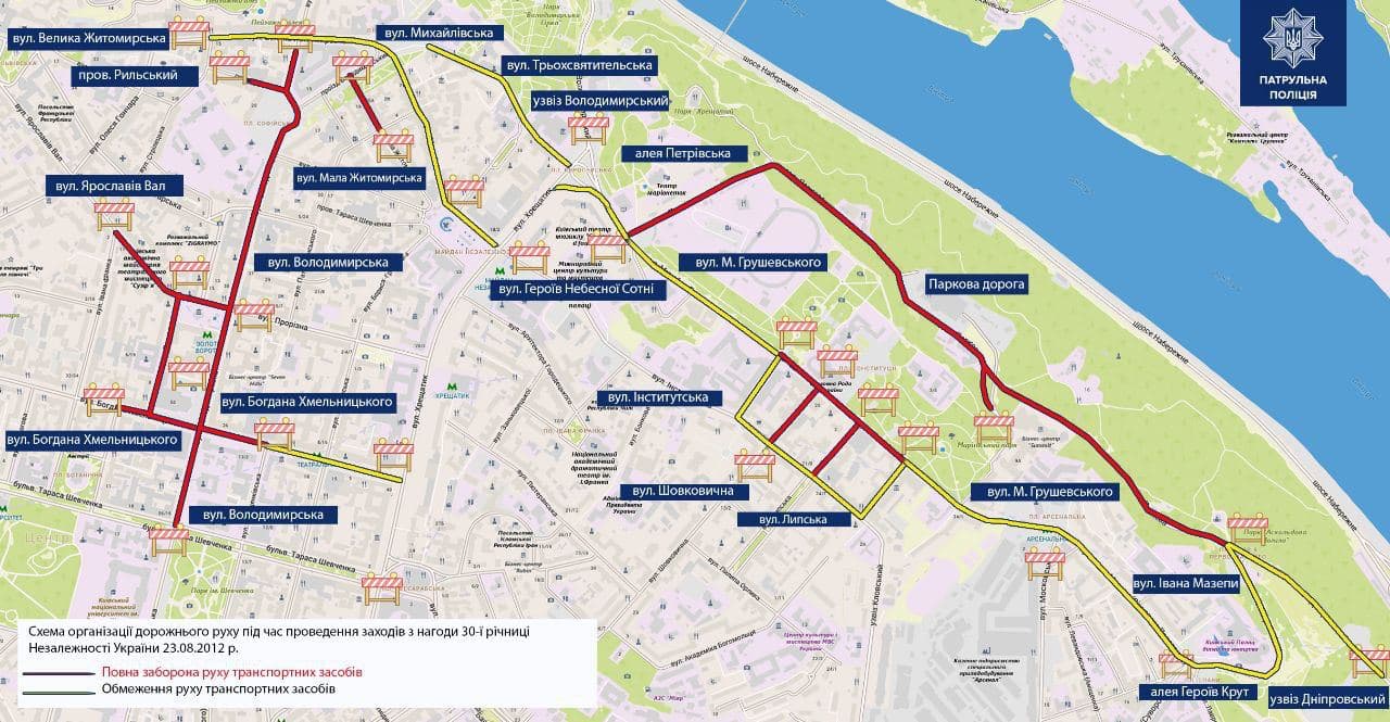 На улице Трехсвятительской (от Михайловской площади до Европейской площади) и улице Липской (от Михаила Грушевского до Институтской) движение ограничено до 22:00 24 августа.