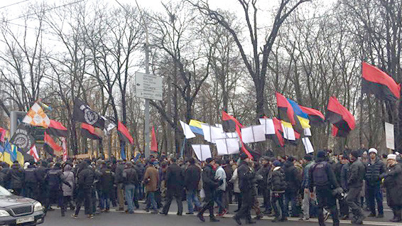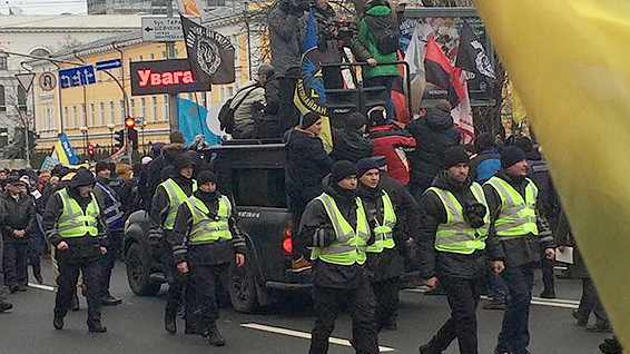 Колонна движется по бульвару Шевченко в сторону Майдана Независимости в сопровождении около 1200 правоохранителей. Они планируют пойти к Администрации Президента и Верховной Раде. Колонну возглавляет Саакашвили и его соратники в сопровождении священника.