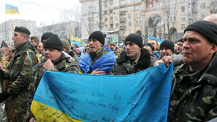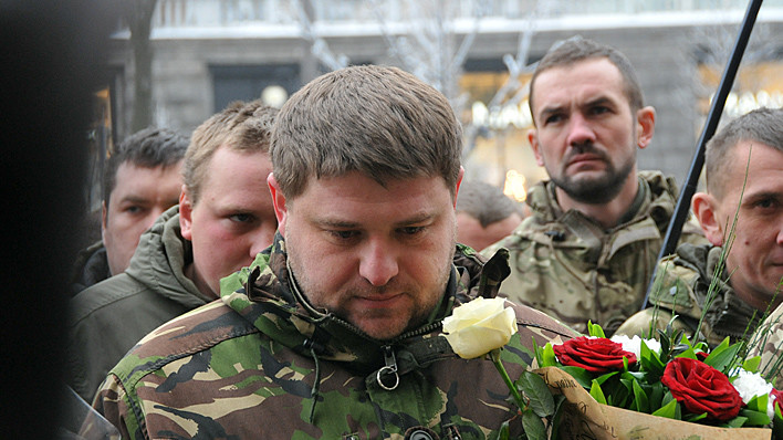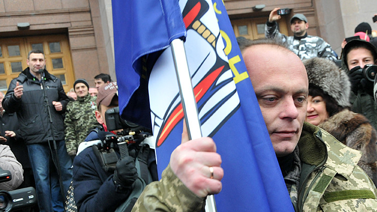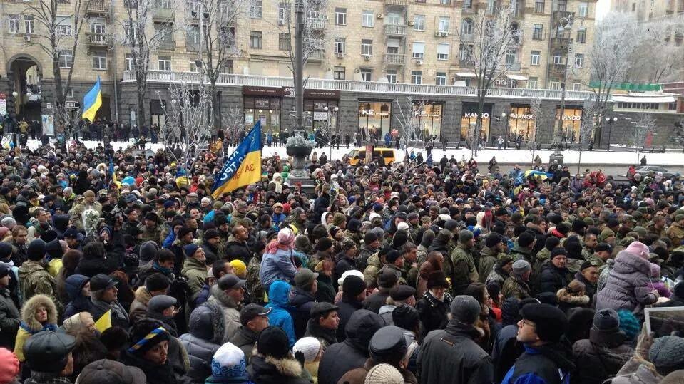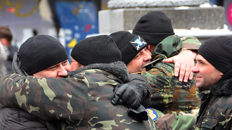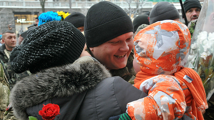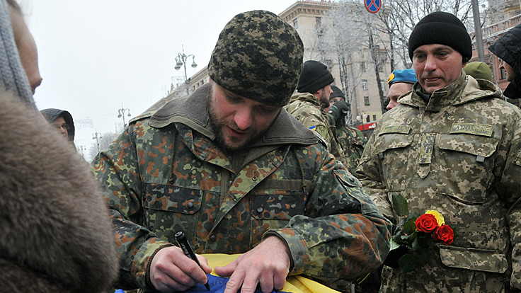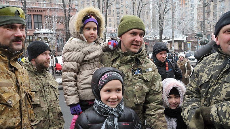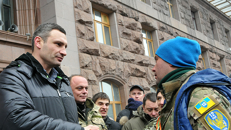 Представители батальона и участники "Автомайдана" встретились возле здания КГГА. Встреча состоялась в сопровождении оркестра. Мэр Киева Виталий Кличко вручил награды бойцам по случаю дня Вооруженных сил Украины.