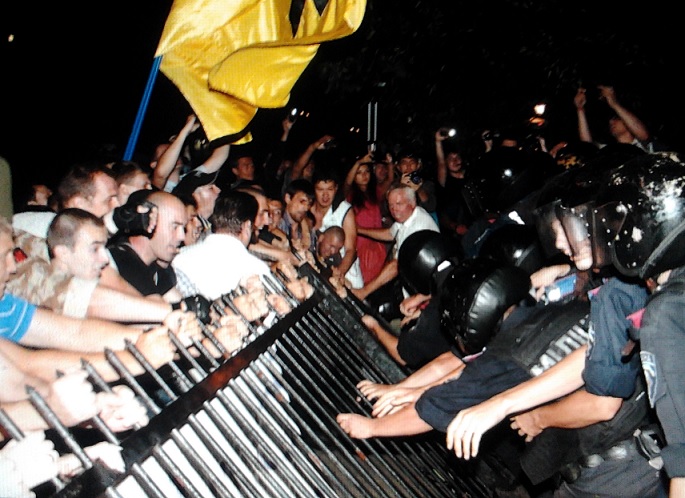 Около 22:00 протестующие повалили забор у Святошинского райуправления милиции и попытались проникнуть в помещение.