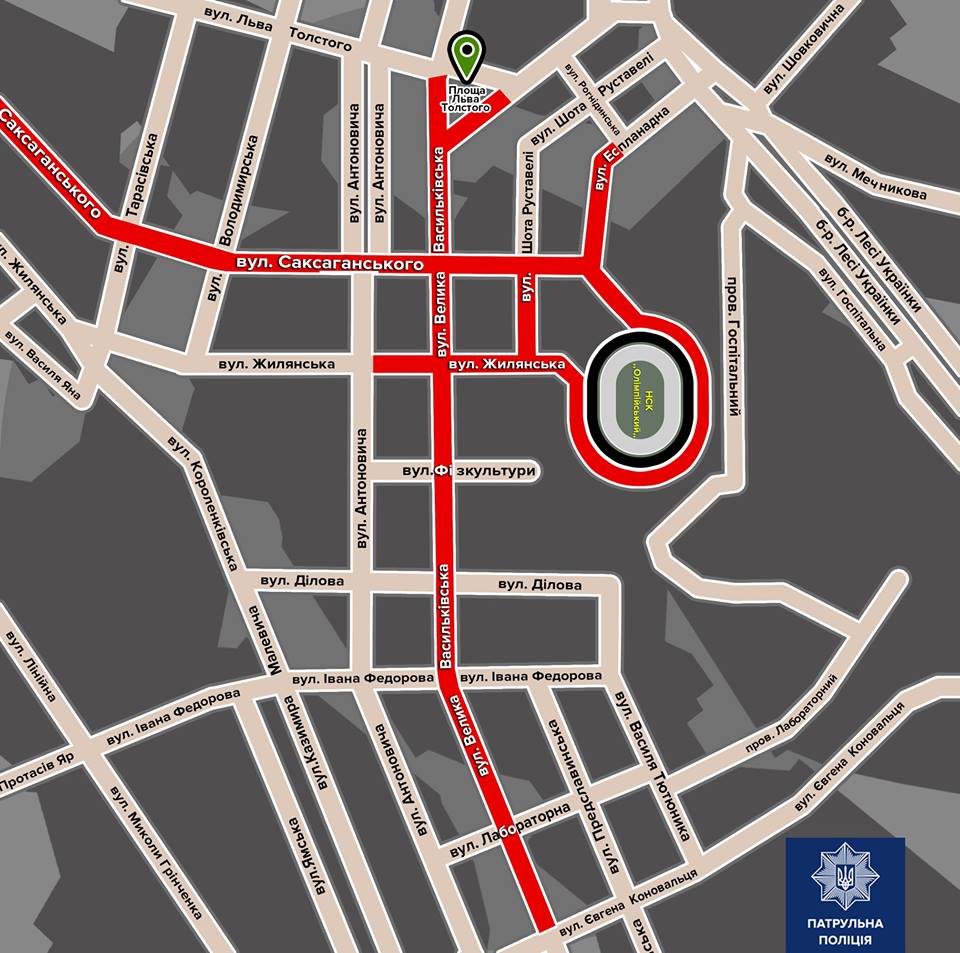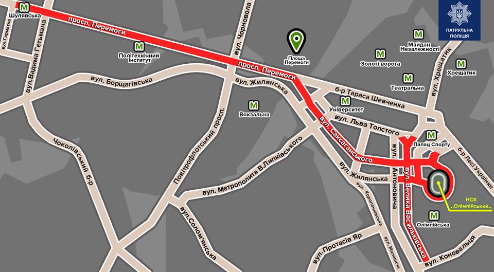 Для проезда будут открыты: проспект Победы (четная сторона), улица Дегтяревская, улица Жилянская к НСК "Олимпийский", улица Борщаговская.