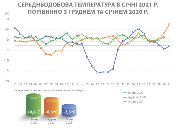 Среднемесячная температура в январе 2021 года в Киеве составила -2,5°С, что на 3°С ниже, чем в январе прошлого года (+0,8°С), и на 1,9°С ниже, чем в декабре (-0,6°С).