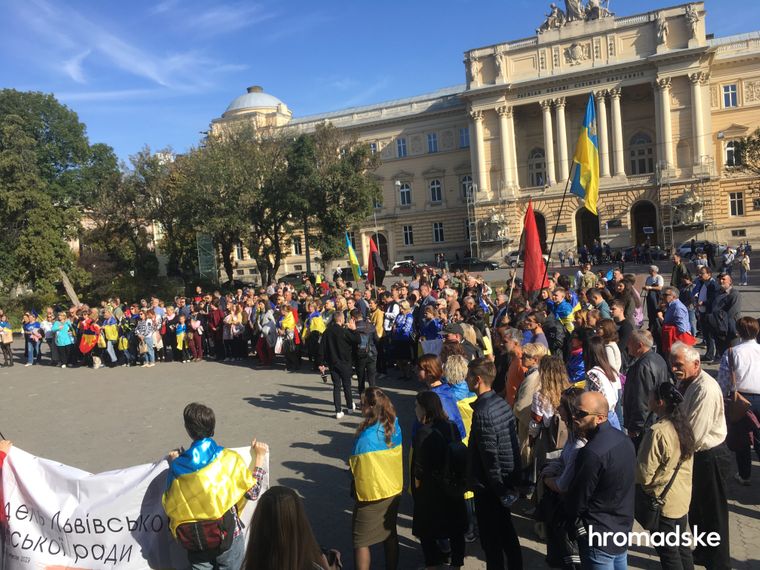 От памятника Вячеславу Чорноволу активисты прошли по центральным улицам города с плакатами "Нет капитуляции" и "Спасибо защитникам". Возле памятника Ивану Франко активисты провели вече.