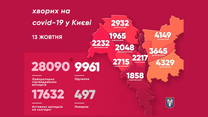 В Киеве по состоянию на 13 октября 28 090 подтвержденных случаев заболевания COVID-19.