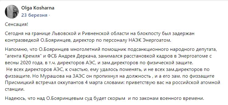 «Но Мурашова на ЗАЭС он пропихнул на должность, и его зам. по физзащите Присмицкий встречал оккупантов 4 марта словами: приветствую вас на российской атомной станции. Надеюсь, что над О.Бояринцевым суд будет скорым  и по законам военного времени», – добавила Кошарная.