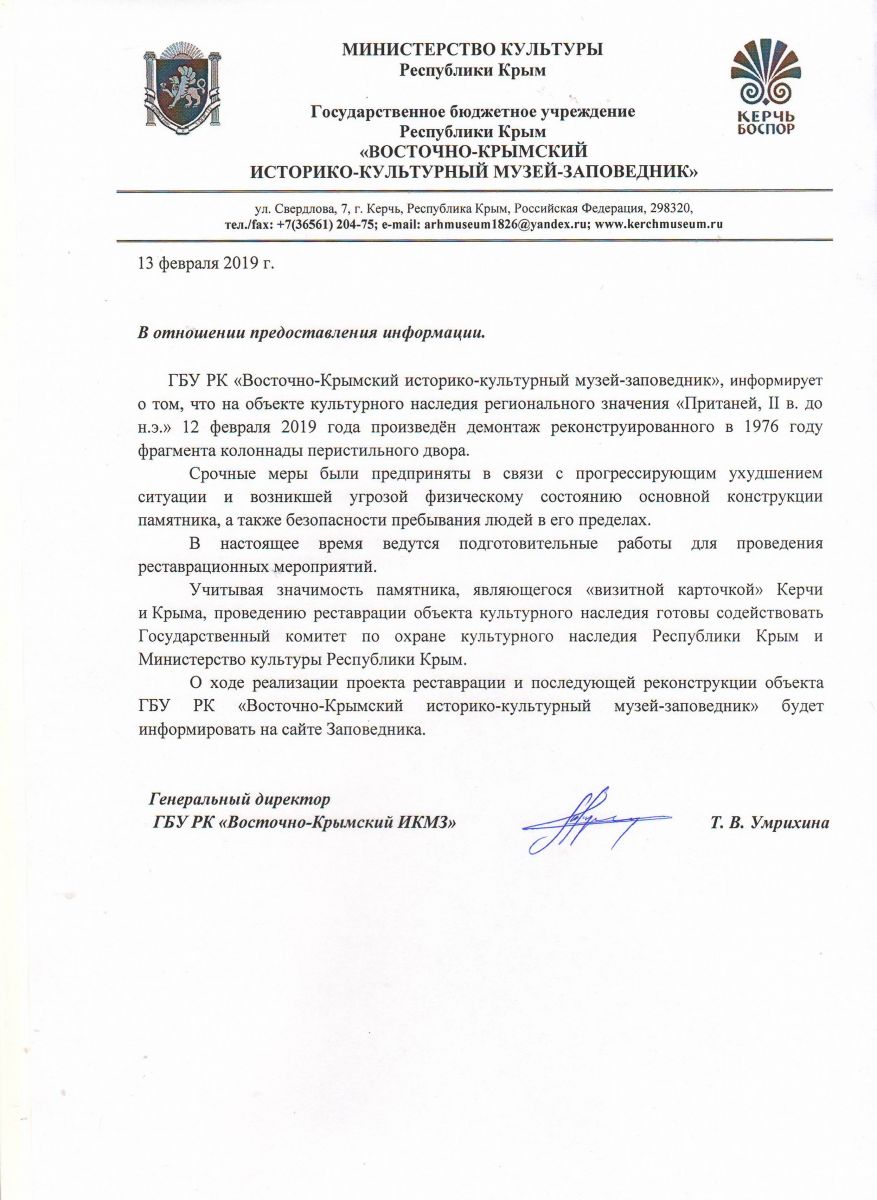 Тем временем в Восточно-Крымском историко-культурном музее-заповеднике заявили о том, что вчера, 12 февраля, был проведен "демонтаж реконструированного в 1976 году фрагмента колоннады перистального двора".