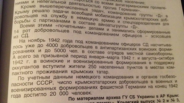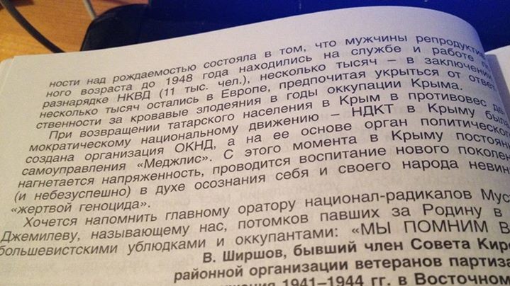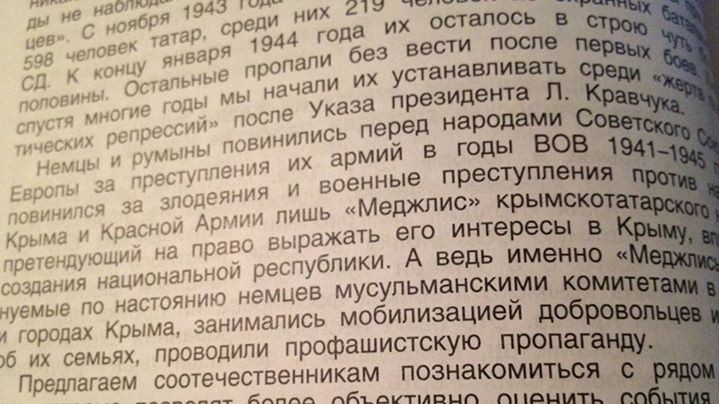 В Крыму отчасти на средства бюджета Кировского района Крыма издан сборник "Книга памяти восточного Крыма "Просили помнить", в которой крымских татар обвиняют в сотрудничестве с фашистами и фактически оправдывают их депортацию.