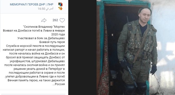 Изначально информацию о гибели наемника опубликовали в публике поддерживаемых Россией боевиков вооруженной группировки "ДНР", которые рассказали, что "Скопинов" воевал в их составе во время боев за Дебальцево Донецкой области.