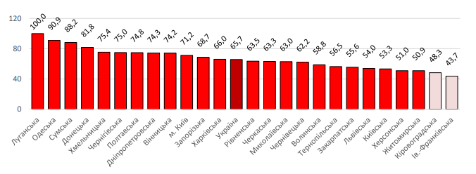 Отмечается, что средний показатель загруженности коек по Украине составляет 65,7%. При этом, как свидетельствуют данные СНБО, в Кировоградской (48,3%) и Ивано-Франковской (43,7%) областях загруженность коек ниже предельного уровня.
