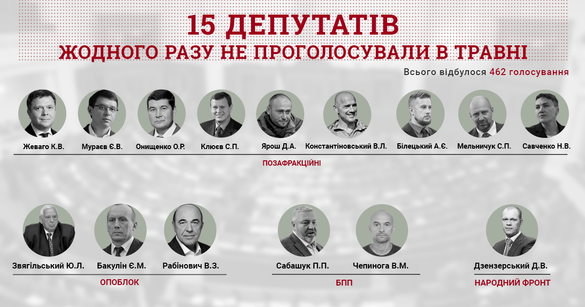 Пятнадцать народных депутатов не проголосовали в мае ни разу. Среди депутатов, которые не проголосовали ни разу (не нажимали "за", "против", "воздержался"): Вадим Рабинович и Ефим Звягильский ("Оппозиционный блок"), Евгений Мураев, Дмитрий Ярош, Андрей Билецкий, Константин Жеваго, Сергей Мельничук (внефракционные), Петр Сабашук, Виталий Чепинога (БПП), Денис Дзензерский (НФ).
