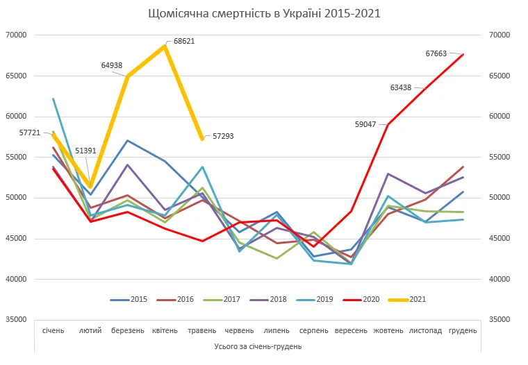 Как отмечает системный аналитик и автор ZN. UA Евгений Истребин в Facebook, если сравнивать смертность в мае 2021 года со средней смертностью 2016-2020 годов, то за две волны Covid-19 мы потеряли 95 тысяч человек в дополнительной смертности.