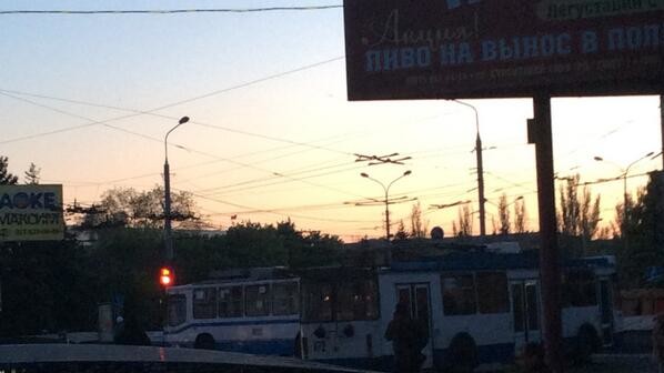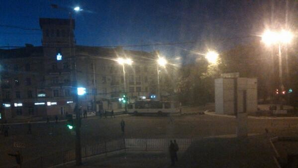 У Дома связи проспект Ленина перекрыт троллейбусом, который стоит поперек дороги. Движение транспорта на просп.Металлургов также перекрыто троллейбусом, рядом с которым лежит ряд из автомобильных шин, однако они не горят.