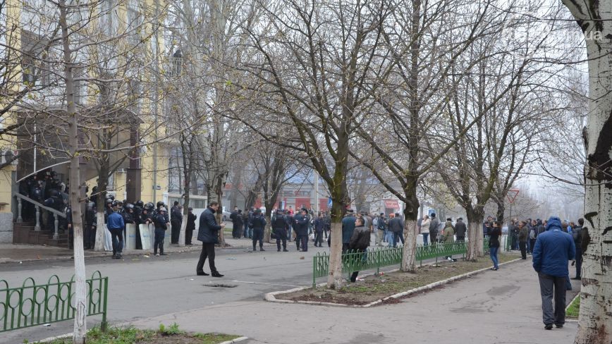 Вечером 13 апреля в 3 (Донецкая область) рядом со зданием горуправления милиции были избиты митингующие за единство Украины.
