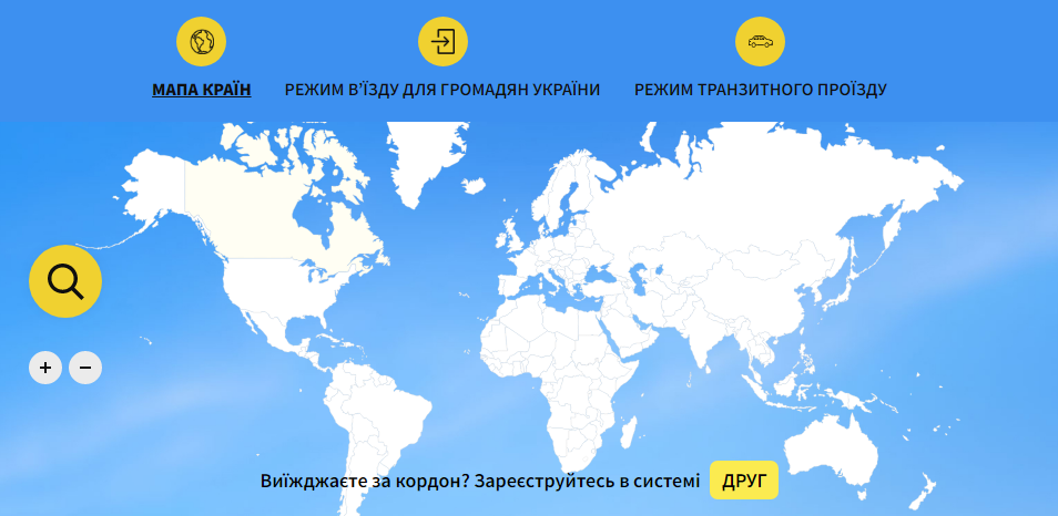 У карты есть два уровня информации: режим въезда для граждан Украины в зарубежную страну и режим транзитного проезда. При этом зеленым цветом обозначаются страны, в которые въезд разрешен всем, желтым - с видами на жительство, а оранжевыми - куда въезд запрещен.