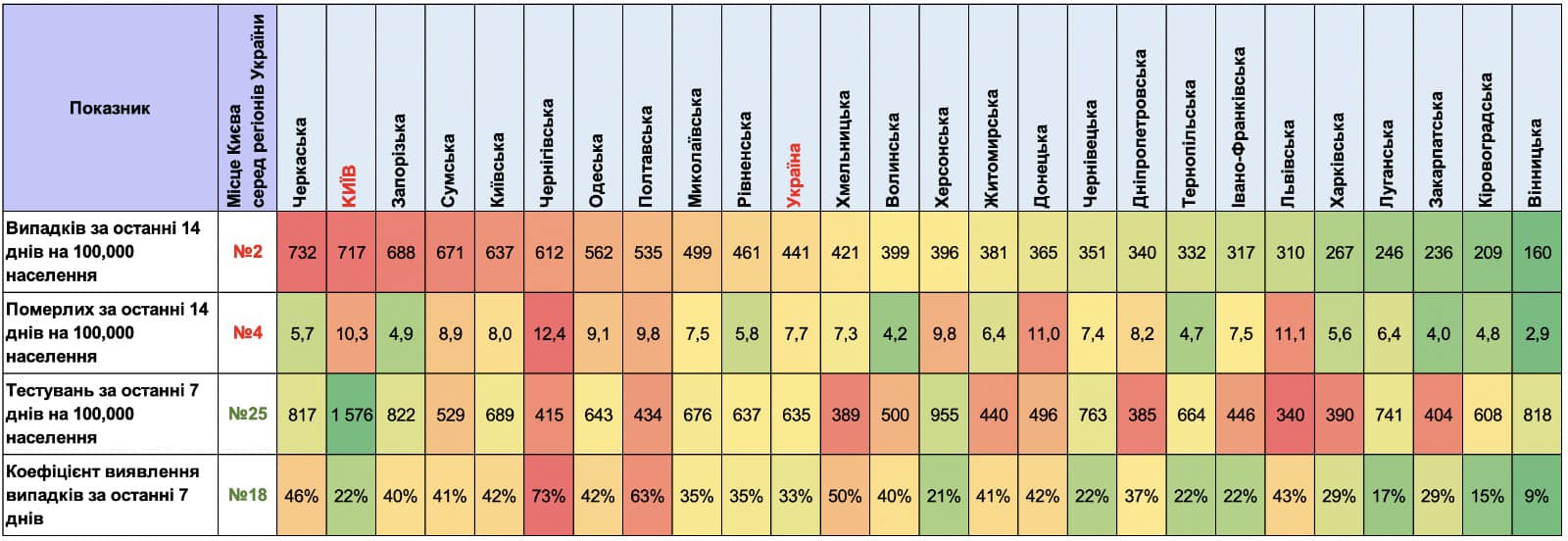 Самый плохой показатель смертности за последние 14 дней на 100 тысяч населения зафиксирован в Черниговской области - 12,4. Также критическая ситуация наблюдается в Харьковской (11,1), Донецкой (11), Херсонской и Полтавской (по 9,8) областях.