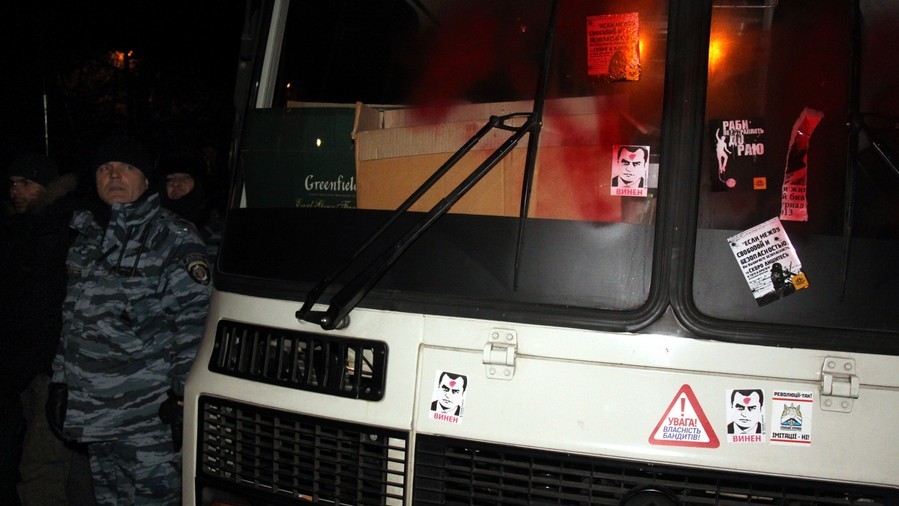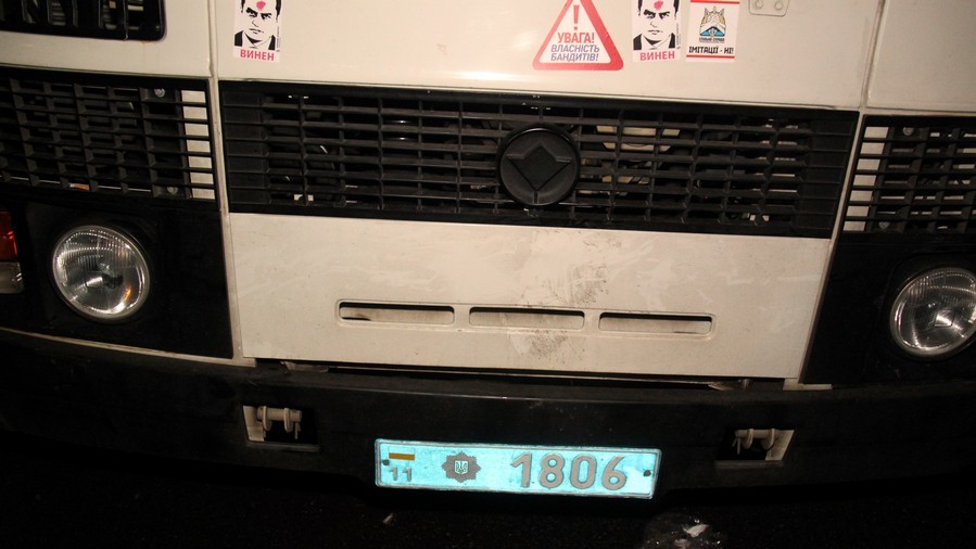 Для обеспечения беспрепятственного проезда служебного автомобиля сотрудники спецподразделения "Беркут" оттеснили митингующих от авто, создав коридор для его проезда. Началась потасовка. Одновременно неизвестные, бросая камни в сторону правоохранителей, повредили стекло автомобиля полка конвойной службы милиции.