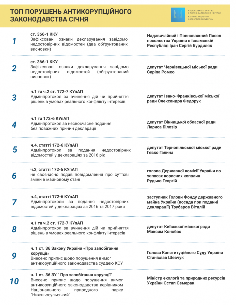 В Национальном агентстве по вопросам предотвращения коррупции (НАПК) обнародовали рейтинг нарушений антикоррупционного законодательства за январь. Так, на первом месте – обоснованные выводы относительно декларирования заведомо недостоверных сведений послом Украины в Иране Сергеем Бурдиляком, сообщает пресс-служба ведомства.