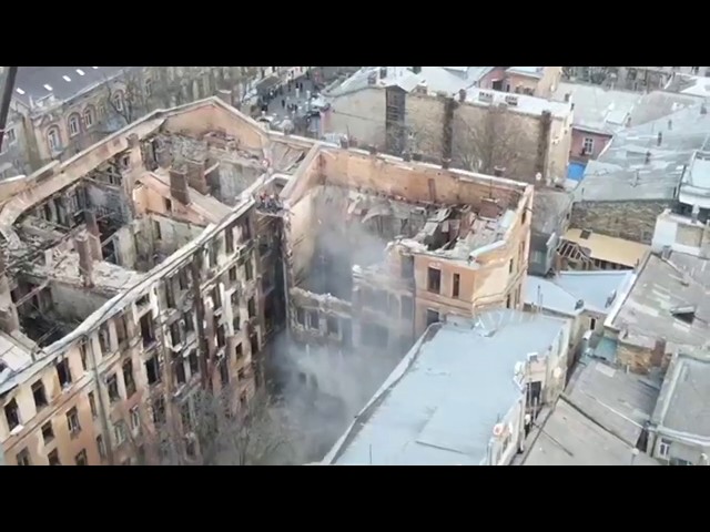В Одессе верхнюю часть сгоревшего здания экономического колледжа обрушили во внутренний двор на тюки соломы и деревянные поддоны. Демонтаж аварийного флигеля проводили сегодня днем, на этот период перекрывали улицу Пушкинскую и выводили жильцов из соседнего дома.