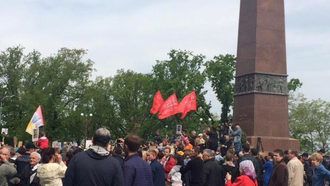 В понедельник, 9 мая, в Одессе у памятника Неизвестного матроса подняли красные знамена с названиями полков, принимавших участие во Второй мировой войне, сообщает ЛІГА.net.