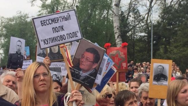 В рамках акции Бессмертный полк участник акции принесли портреты своих предков, принимавших участие во Второй мировой войне, а также погибших на Куликовом поле.
