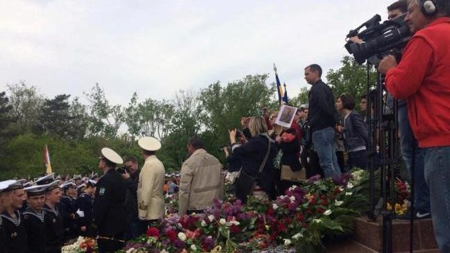 Примерно через полчаса к памятнику Неизвестному матросу подошли курсанты военно-морского училища и военные моряки. Участники акции с красными флагами отошли из-под памятника к Аллее Славы. Курсанты почтили память погибших под флагом Военно-Морских Сил Украины.
