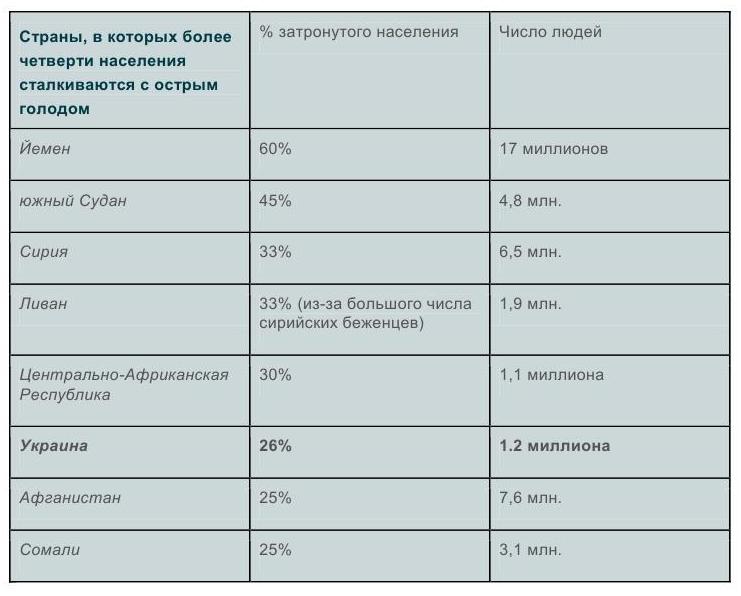 По данным Продовольственной и сельскохозяйственной организации ООН (ФАО), из 4,6 млн человек, оставшихся в оккупированных районах Донецкой и Луганской областей, голодают 26% или 1,2 млн человек.