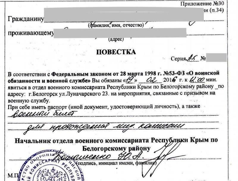 "Вот прислали повестку из Белогорского района, получил крымский татарин 35 лет, 3 детей, младшему 1,5 года. Говорит, что видел список призывников на листе формата А-4, все фамилии крымскотатарские", − сообщил источник на полуострове.