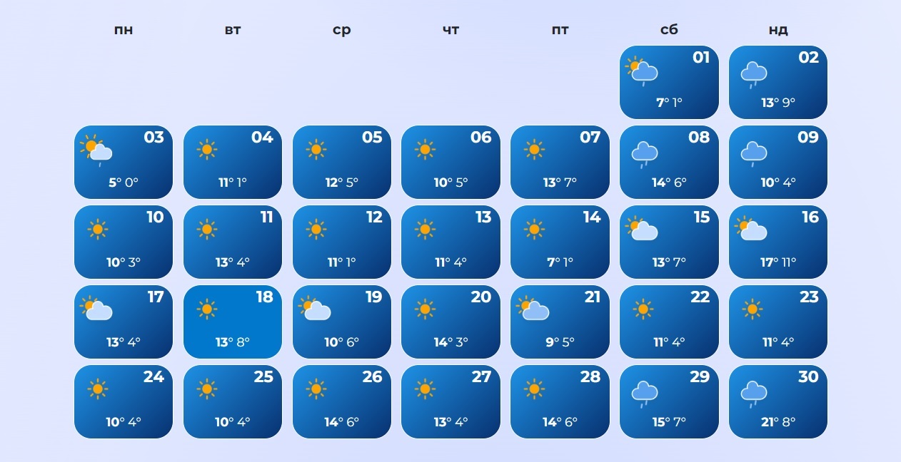 Большого количества осадков не предполагается. В первую неделю ожидаются заморозки до -10 ночью, но постепенно температура будет подниматься. Теплее всего будет во второй половине месяца, самыми теплыми днями станут 14,15,19 и 20 марта. Осадков почти не ожидается. По сравнению с февралем существенно возрастет количество солнечных дней.