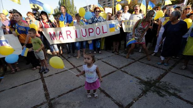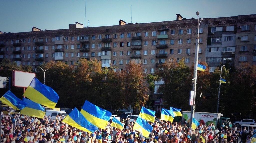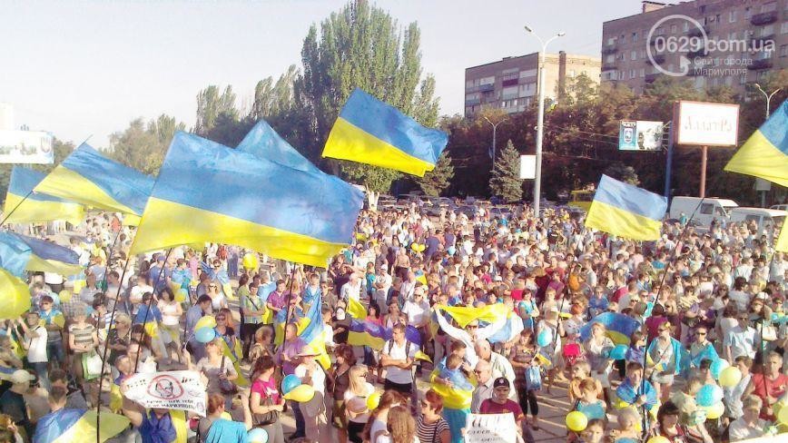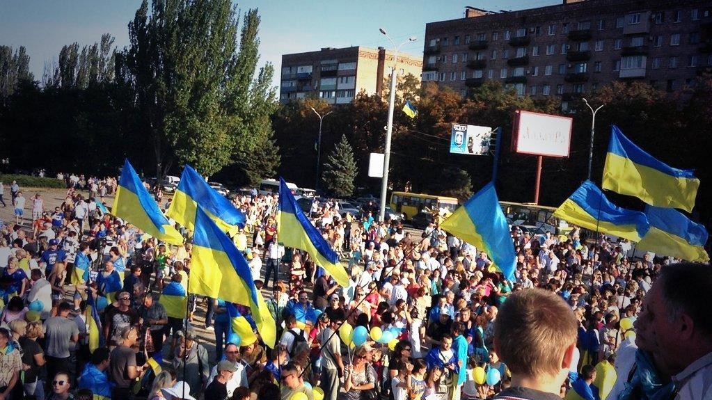 В Мариуполе Донецкой области продолжается митинг за единство Украины. Не менее тысячи мариупольцев собрались на центральной площади города под государственными флагами Украины.