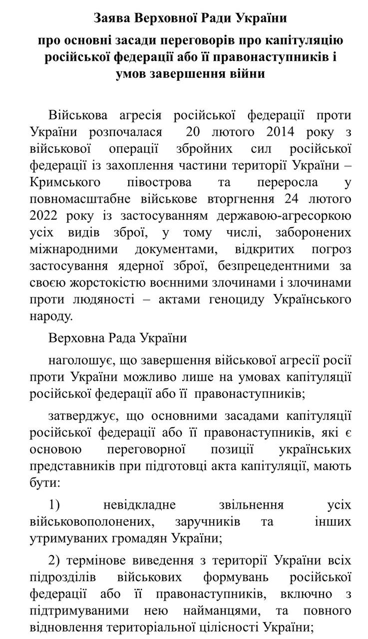 В Верховной Раде был зарегистрирован проект постановления, в котором обозначены основные принципы переговоров о капитуляции России или ее правопреемниках, а также условиях завершения войны.