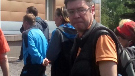 В толпе - около 100 человек в масках. Активисты скандировали " Одессу не простим ! " . Люди со ступенек под заводом играли русские и советские марши. На месте также присутствует журналист и оператор российского НТВ.