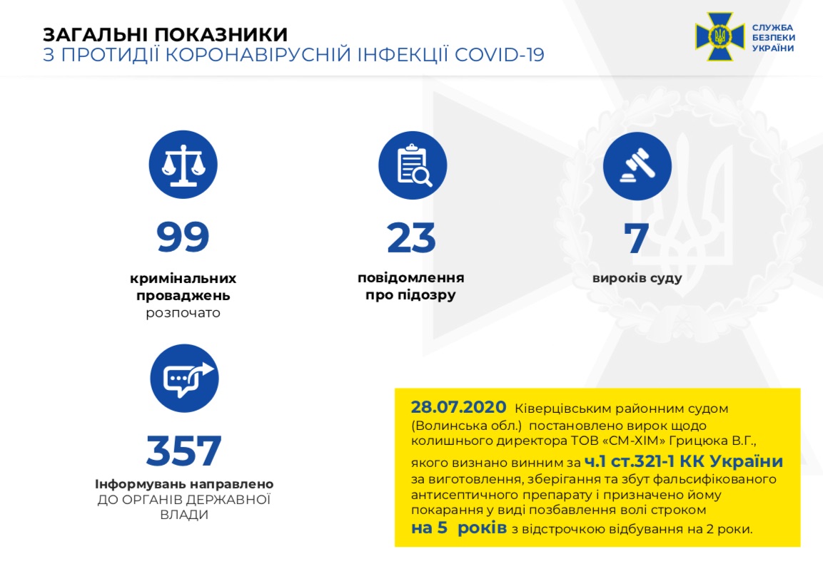 "Также в период пандемии СБУ активно противодействует распространению фейков о COVID-19. Киберспециалисты Службы прекратили деятельность более 450 интернет-агитаторов, которые производили соответствующий контент и дестабилизируют ситуацию в стране", - добавили в СБУ.