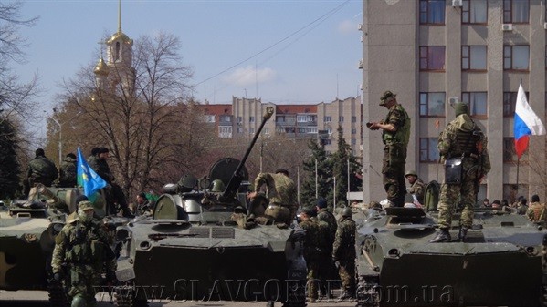 "16 апреля, в Славянск вошло шесть единиц бронетехники, над которыми развиваются российский флаг и флаг Народного ополчения Донбасса. Сейчас бронетехника стоит за исполкомом, в центре города. К военным машинам подходят жители Славянска, скандируют "Молодцы" и "Донбасс". Солдаты при себе имеют оружие", - пишет издание.