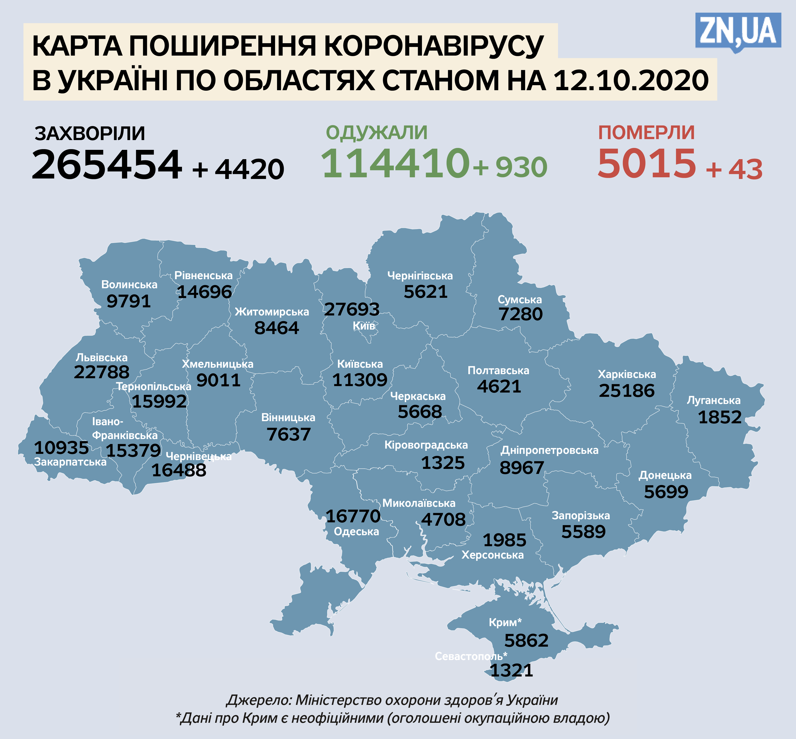 По состоянию на утро понедельника в Украине 265 454 случая заражения коронавирусом, за сутки выявили 4 420 новых случая. Об этом сообщает Совет нацбезопасности и обороны.